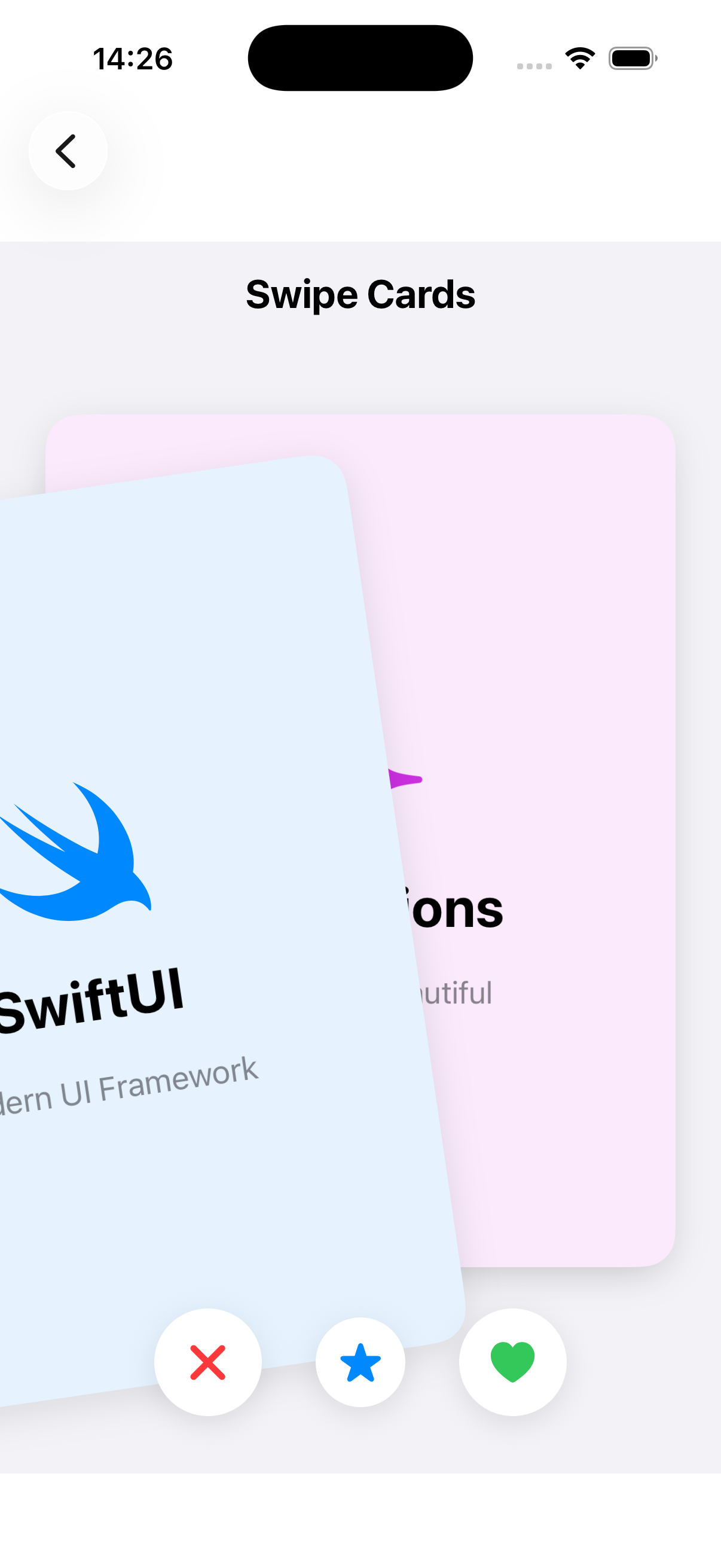 Tinder-style swipeable card stack with smooth animations. Supports swipe left/right/up gestures, visual indicators, programmatic controls, and customizable appearance. Perfect for dating apps, product browsing, or decision-making interfaces.
