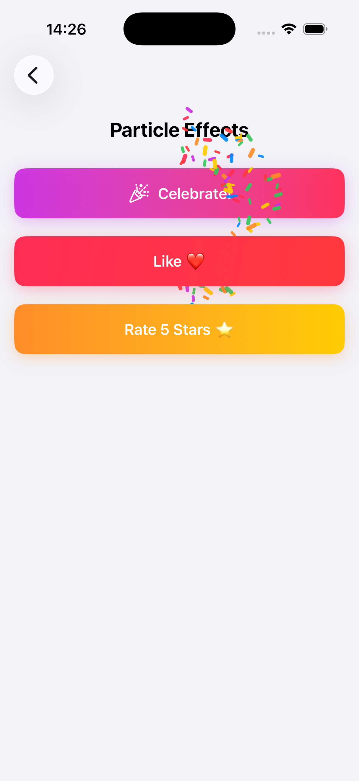 Advanced particle system with confetti, hearts, stars, and custom shapes. Features physics simulation with gravity, customizable colors, sizes, velocities, and emission angles. Includes ready-to-use ConfettiButton and particle emitter modifier.