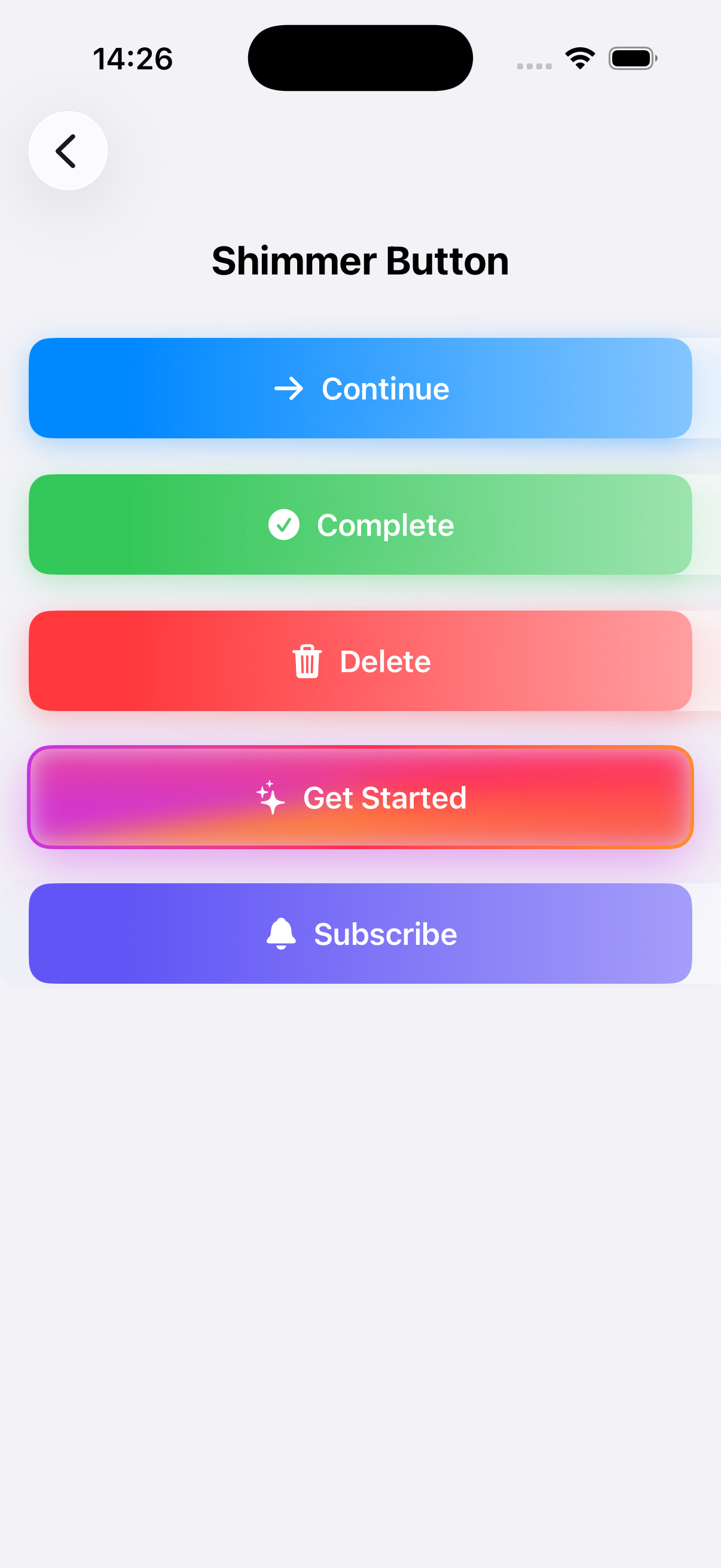 Beautiful animated buttons with shimmer/shine effects. Includes default shimmer, gradient shimmer with rotating colors, and pulse shimmer with expanding rings. Fully customizable with haptic feedback and smooth animations.